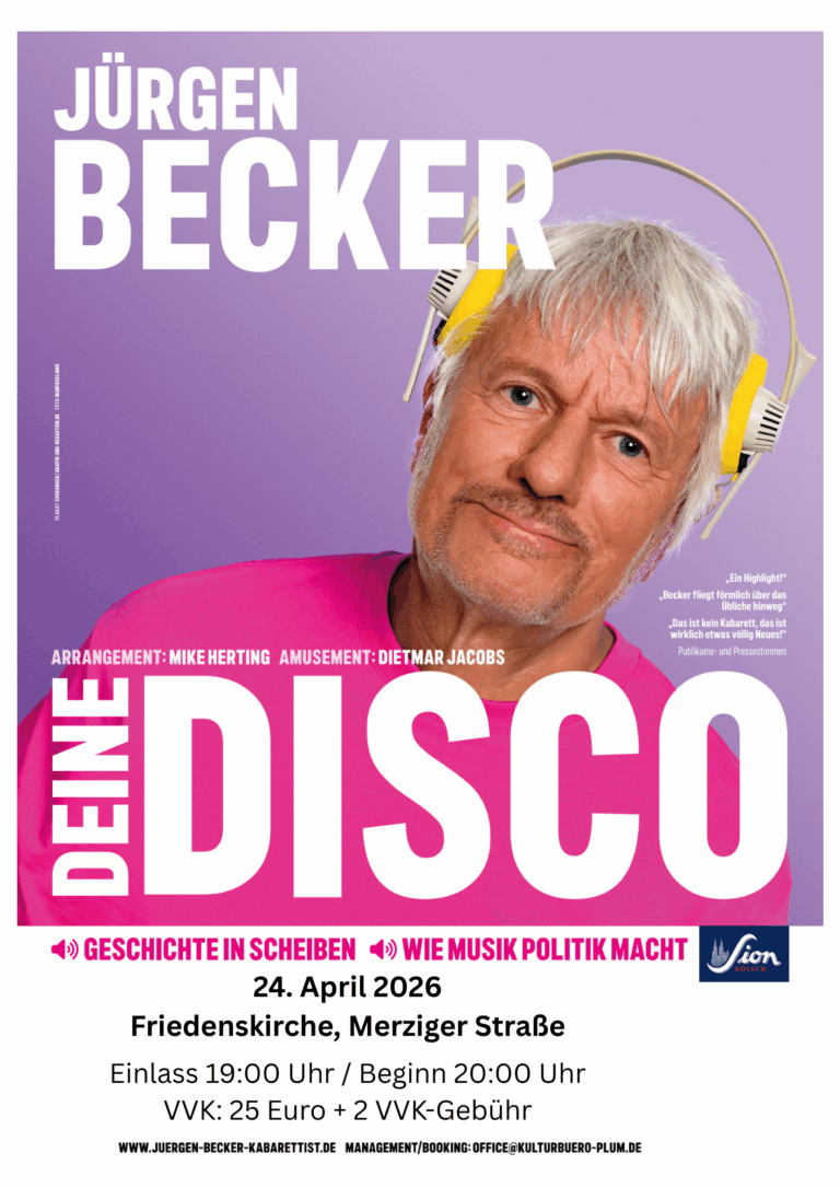 Ohne die revolutionäre Erfindung der E-Gitarre wäre die Geschichte anders verlaufen: So hatten die 68er Jimy Hendrix, die Hippies Janis Joplin und Woodstock, die Hausbesetzer Ton Steine Scherben, die Friedensbewegung Bots & BAP, die Frauenbewegung Ina Deter, die Punker Patti Smith. Es ist der Soundtrack und seine Resonanzen in der Gesellschaft, die eine Bewegung erfolgreich macht. Die Klimabewegung steht heute ohne eigenen Sound da und droht zu verlieren; die Erde wird unaufhörlich heißer. Eine Katastrophe, die Jürgen Becker mit „Deine Disco“ perfekt analysiert. Ein Kabarettprogramm, wie es noch keines gab: Politik, Platten, Protest und Pointen werden als mitreißende Radioshow auf der Bühne live gemischt, man taucht satirisch tief in die Soundfiles der bewegten Jugend und rettet damit am Ende sogar die Zukunft: Follow the Science. Doch vergesst die Emotionen nicht!