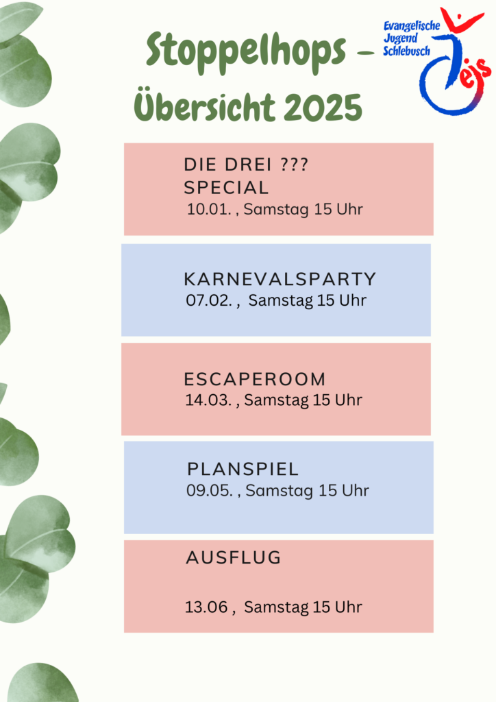An jedem zweitem Samstag im Monat erwarten euch im Jugendhaus „Spiele, Spaß und Spannung.“ Es wird nie langweilig, wenn wir eine Rallye machen, im Park toben oder Mottopartys feiern. Doch bei Stoppelhops gibt es nicht nur Action. Wir basteln, gucken tolle Filme oder bereiten ausgefallene Leckereien zu.